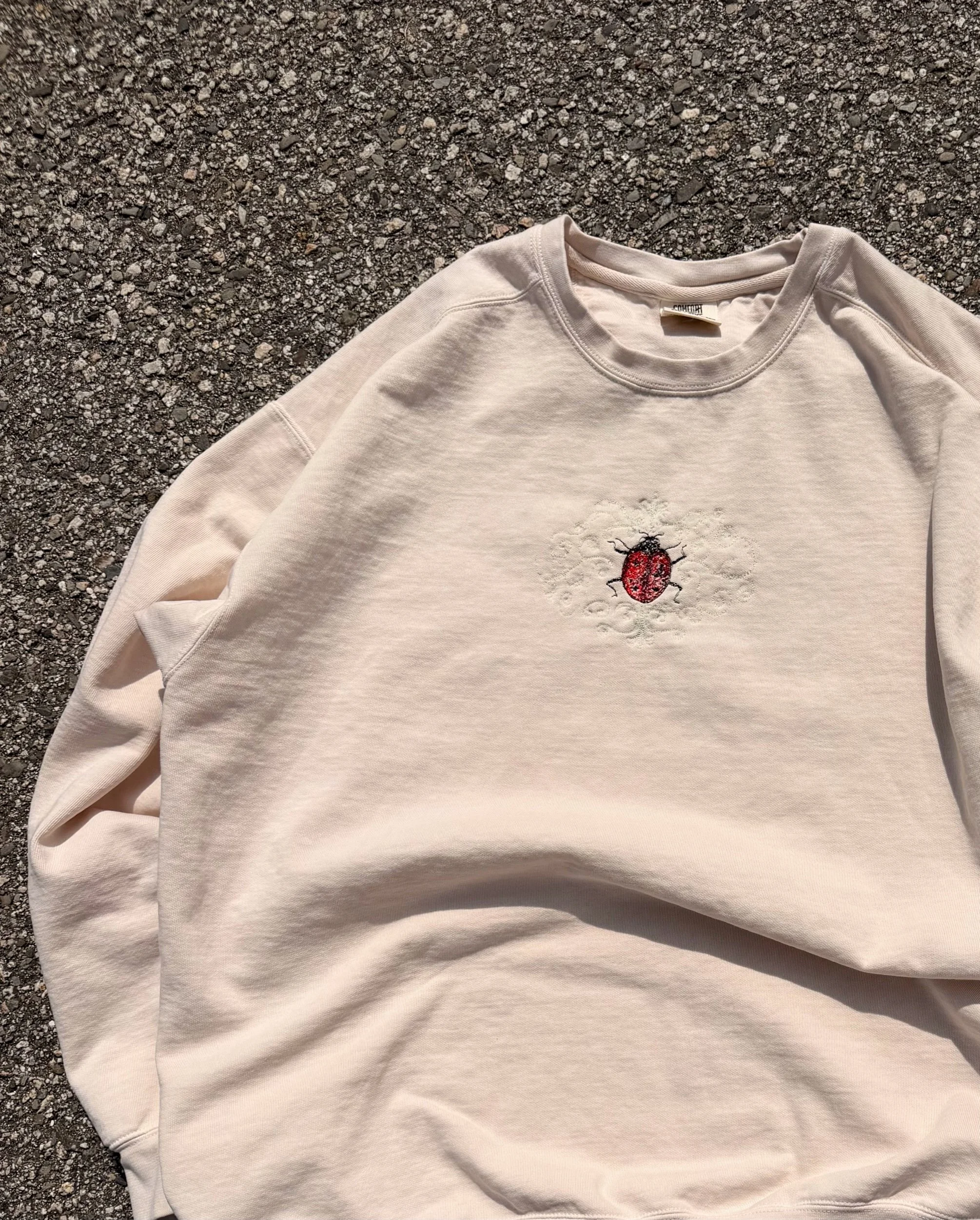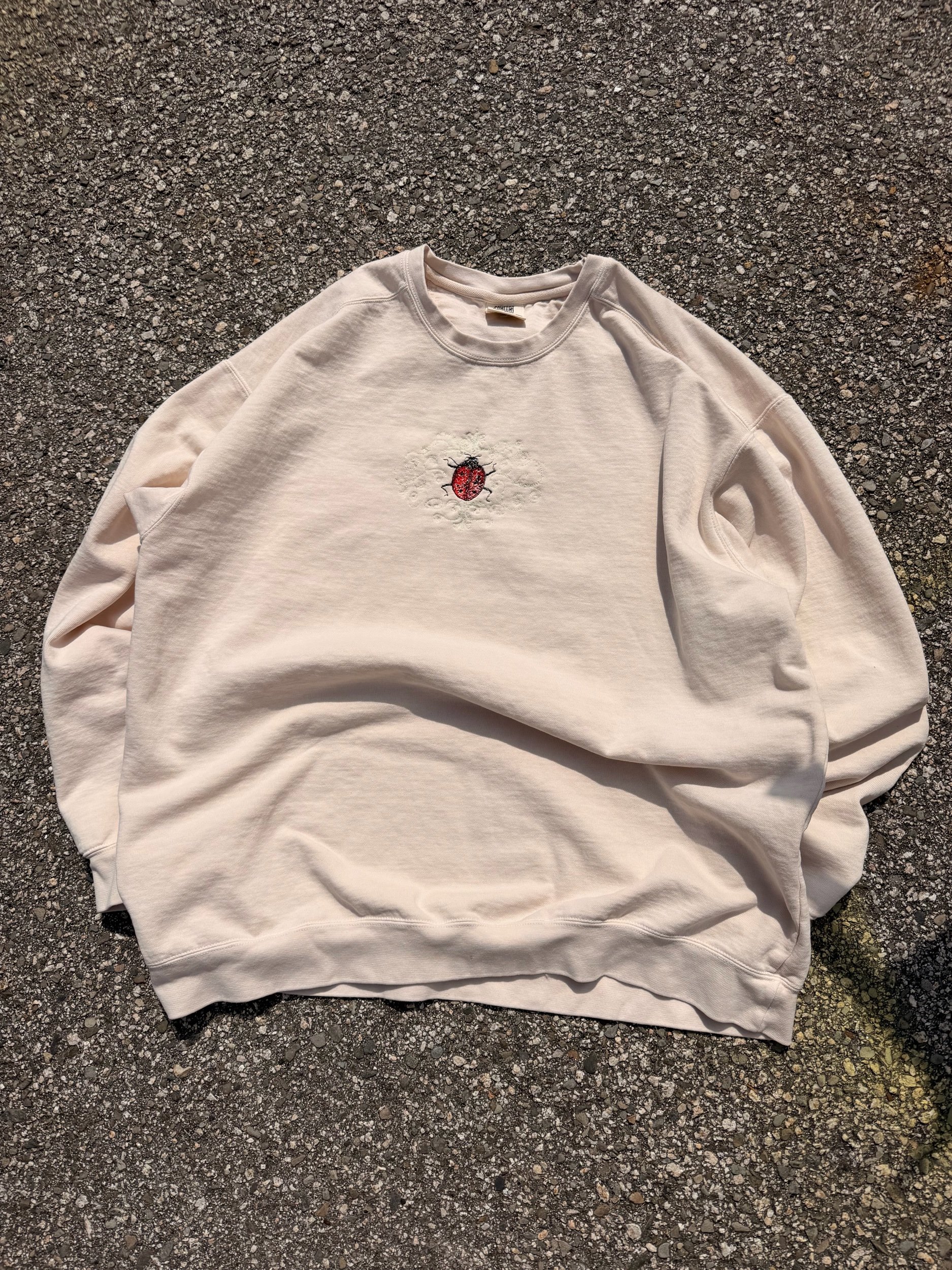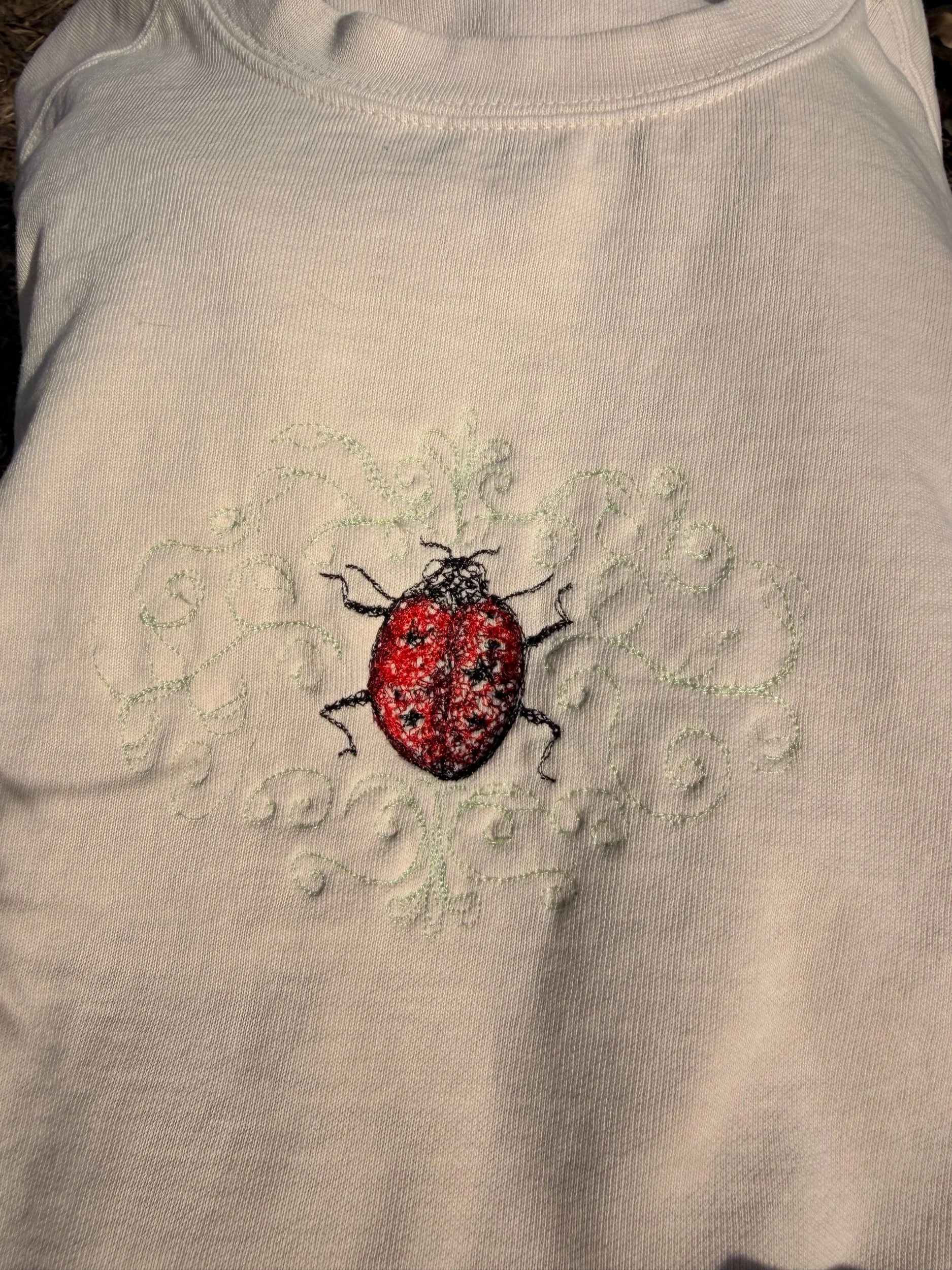 •ladybug embroidery on front— slightly off centered